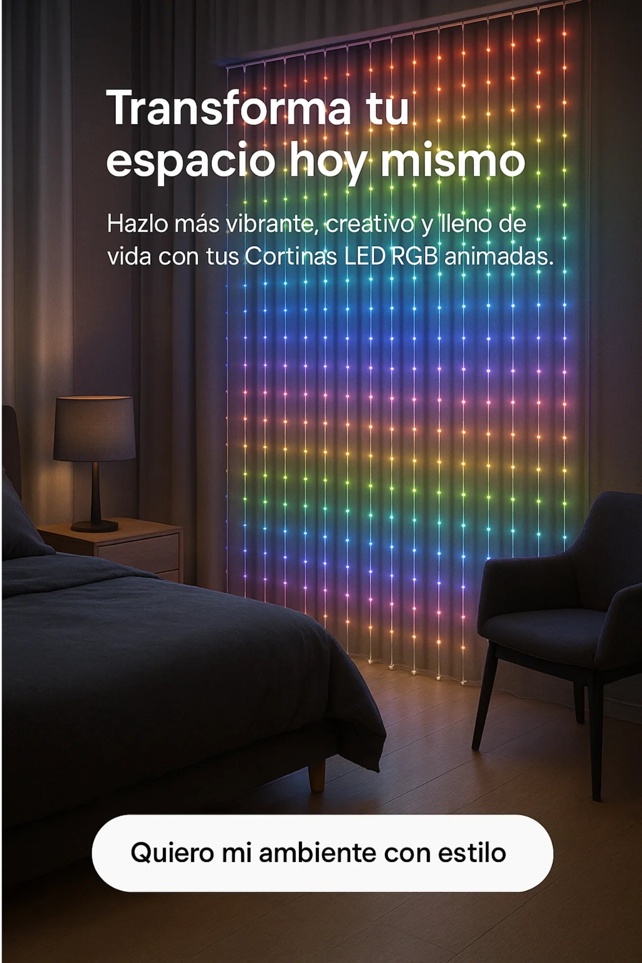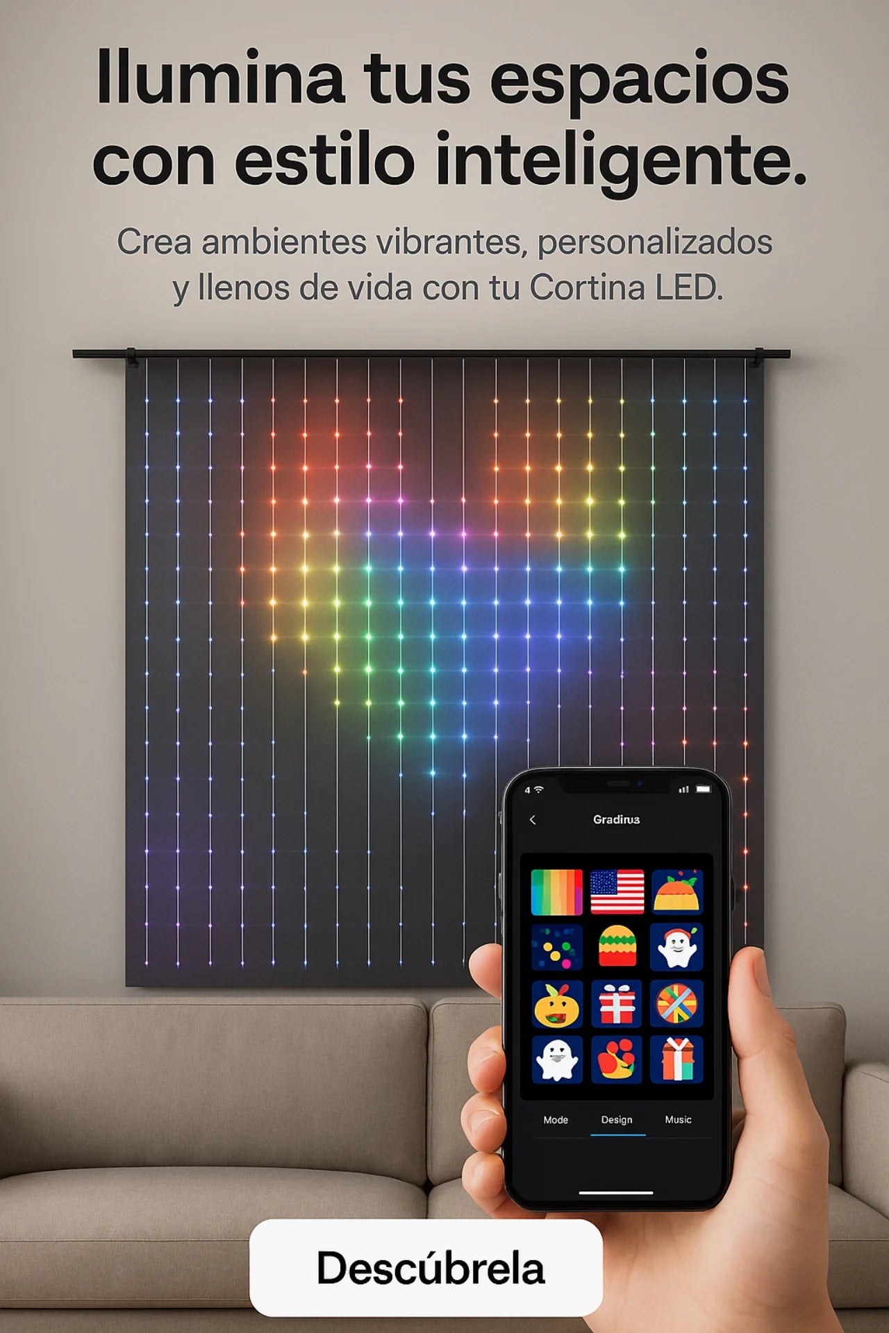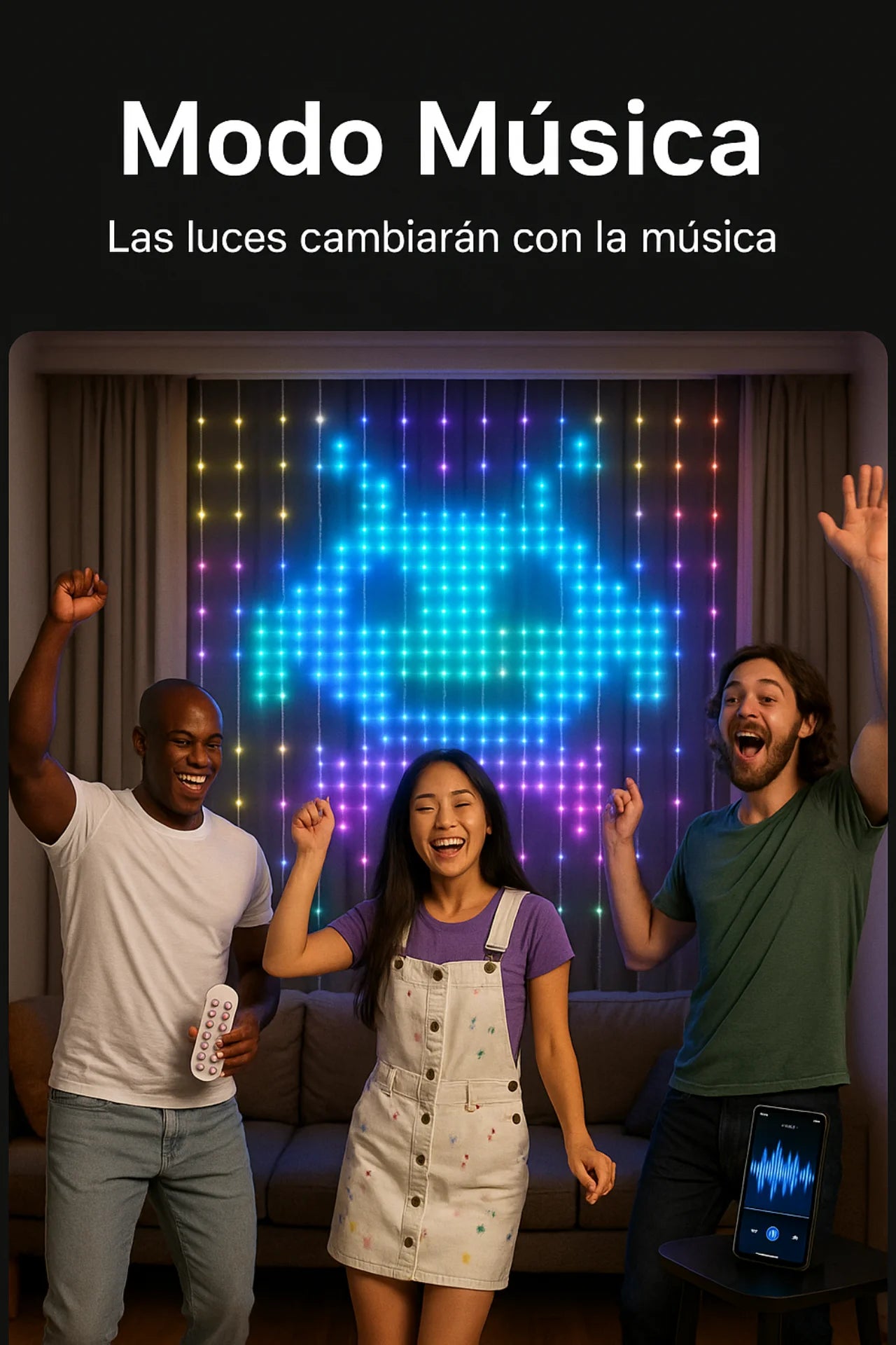 La cortina incluye un control remoto y una app móvil con la que puedes cambiar los colores, la intensidad y los modos de luz. También puedes sincronizarla con tu música o crear patrones personalizados 🎵💡