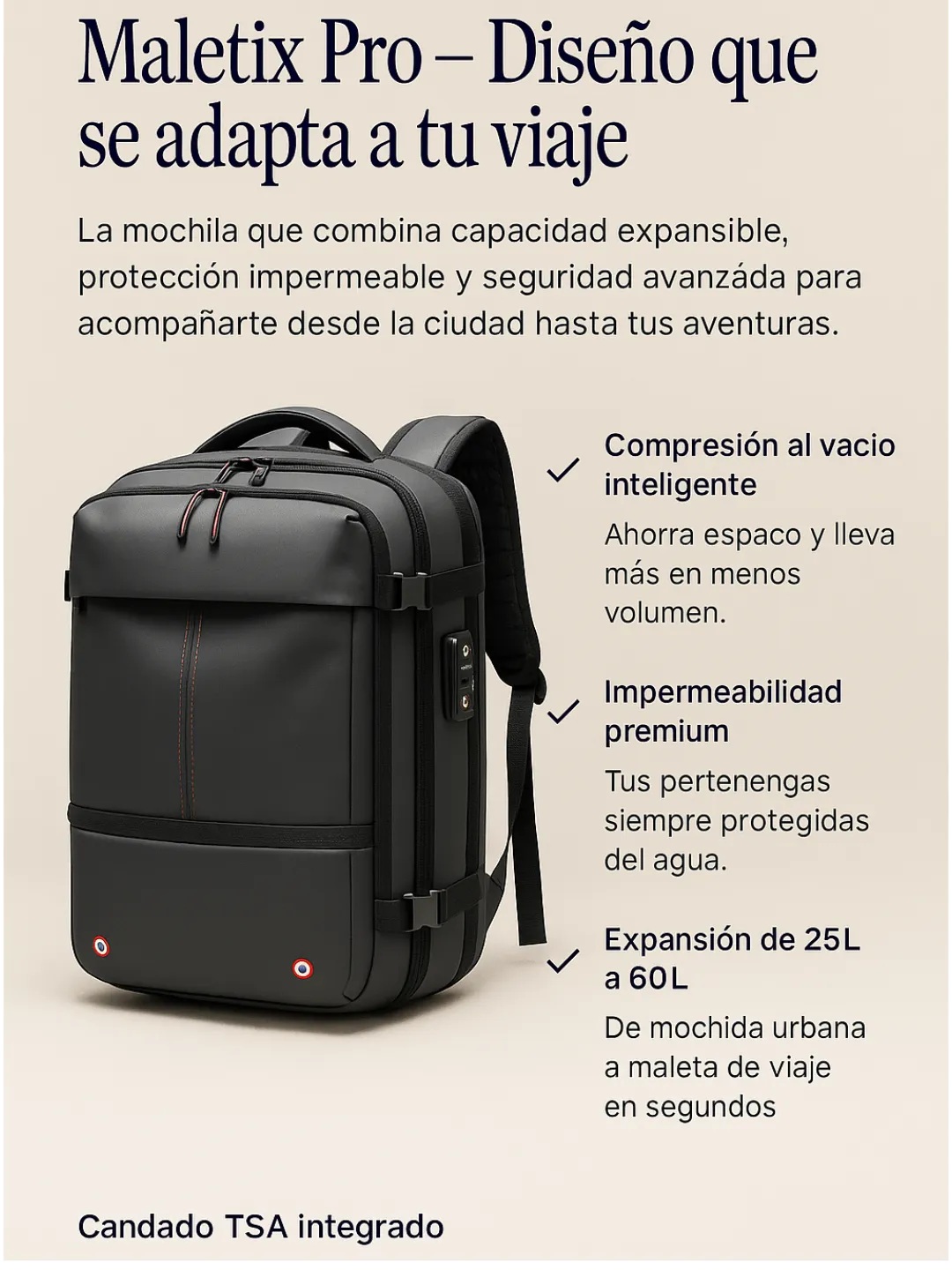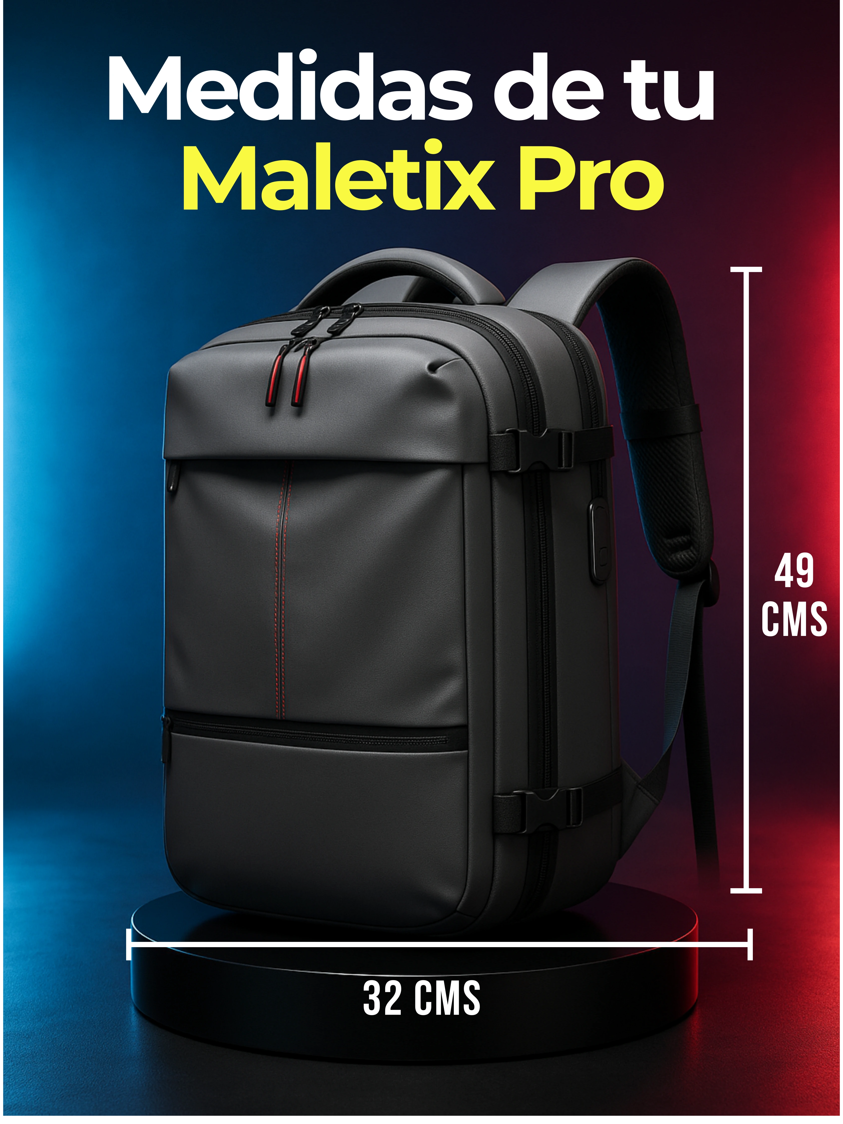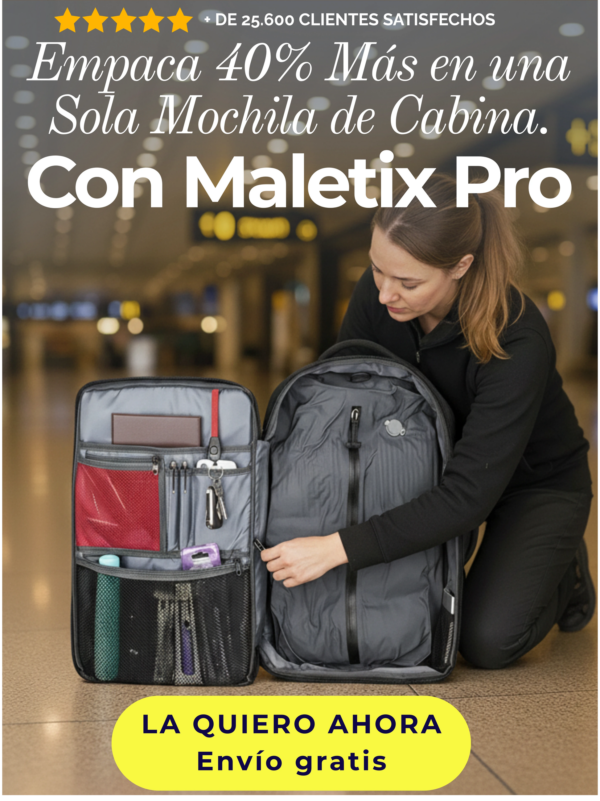 Sí. Maletix fue diseñada con las medidas estándar de equipaje de mano, por lo que puedes llevarla en cabina sin problemas en la mayoría de aerolíneas. Su sistema de compresión te permite aprovechar al máximo el espacio sin superar los límites permitidos. Ideal para viajes cortos o escapadas de fin de semana.