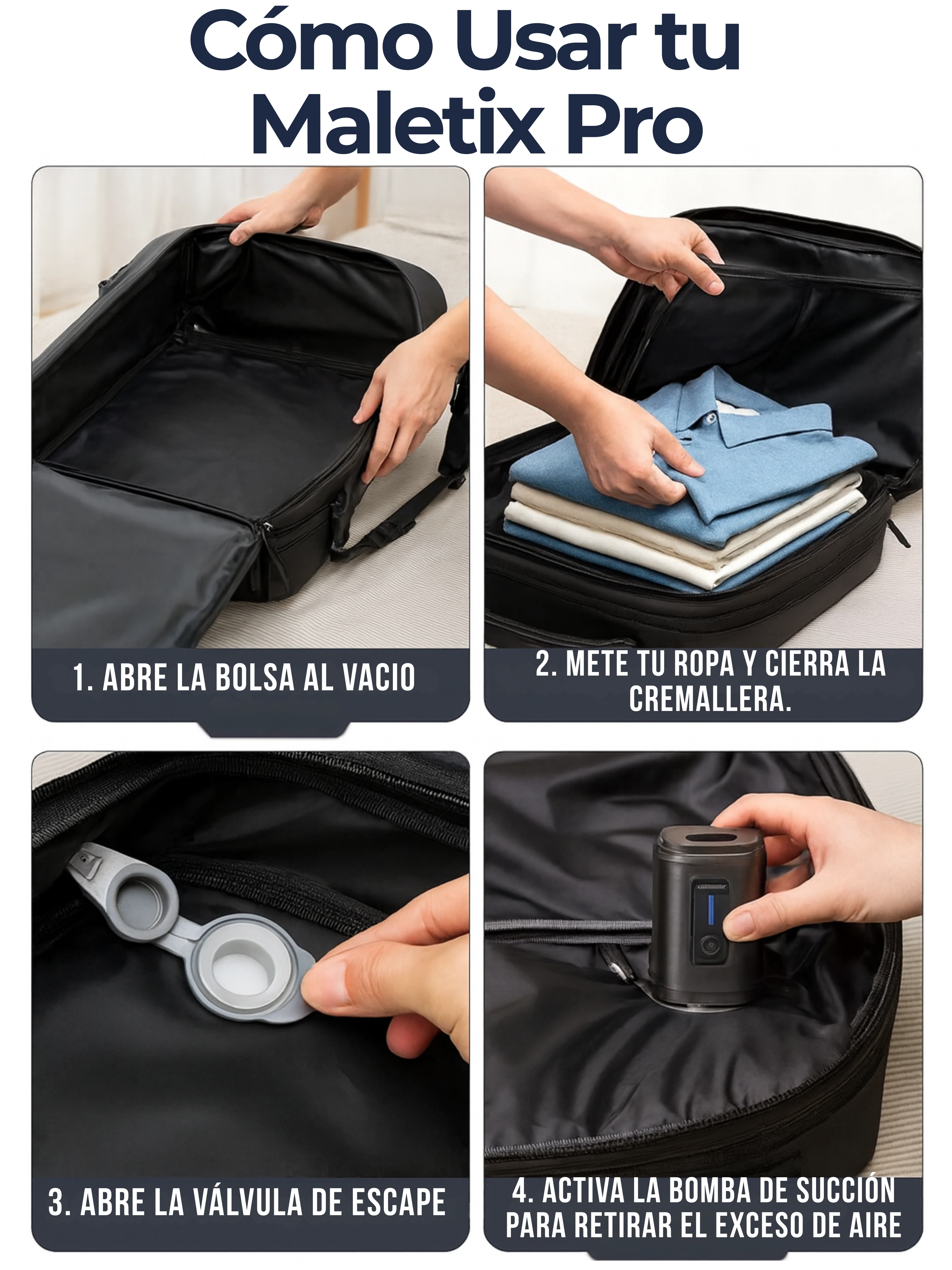 El sistema de compresión al vacío es completamente intuitivo. Solo colocas tu ropa en el compartimento, cierras la válvula y utilizas la bomba eléctrica incluida para eliminar el aire. En segundos, reduces el volumen y ganas espacio adicional para otros objetos, manteniendo todo ordenado y libre de arrugas.